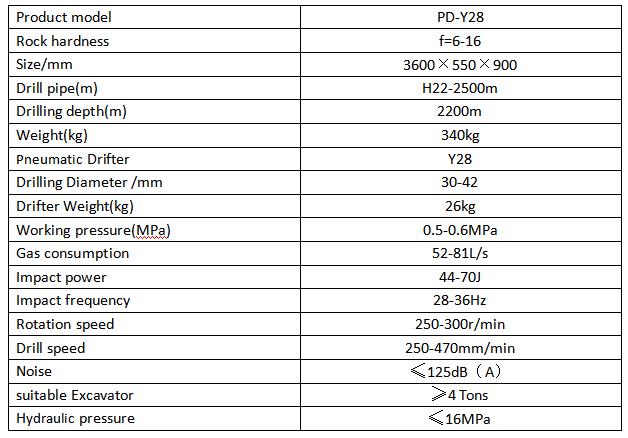 Pneumatic Rock Drill Attachment for Mini Excavator changes the tradition of manual hand-held pneumatic rock drills.Y28 is installed on a rail that can swing and move up and down, and then the rail is installed on the excavator with a quick-change connector. Y28 drilling operation still uses air compressor to drive Y28 for drilling, but the drilling angle and the movement of the rock drill are derived from the hydraulic power of the excavator, which is controlled by the imported electromagnetic control valve sets. The operator uses electric control box knob controls the drilling operation in the cab, which is convenient, fast, safe and efficient. Y28 improves the working environment, work efficiency and reduces labor intensity.