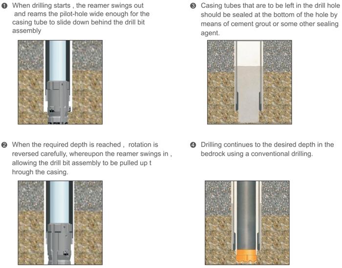 1. When drilling starts, the reamer swings out and reams the pilot-hole wide enough for the casing tube to slide down behind the drill bit assembly.
